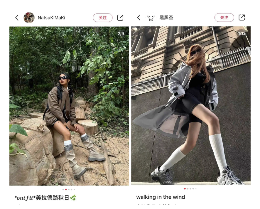 工裝褲、休閑褲是常規(guī)操作,搭配瑜伽褲還能玩?zhèn)下半身失蹤術(shù),反正沖鋒衣夠?qū)挻竽苌w住大腿,腳踩UGG,成為社交平臺上秋天的第一個辣妹。