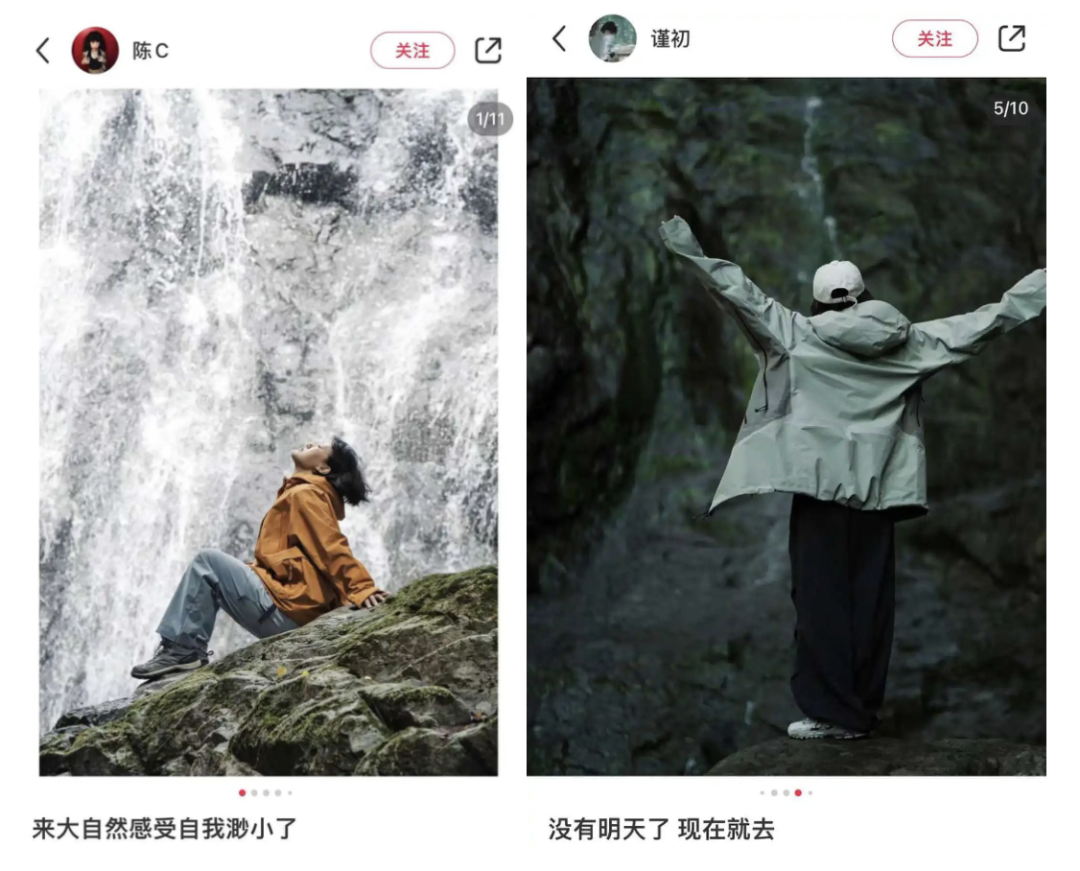 不管什么價格的沖鋒衣,只有真正走進大自然里,才能展現(xiàn)出它的舒展和魅力。同樣一件衣服站在瀑布面前和在大街完全是兩種效果,再普通的沖鋒衣,只要有身后山山水水的加持,都能瞬間讓打工人心生向往。年輕人的沖鋒衣,沖的不就是個氛圍。