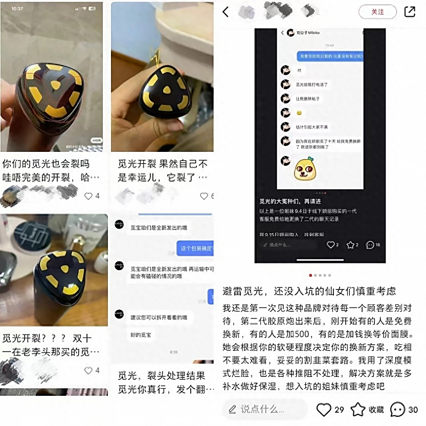 不僅如此,AMIRO覓光的品控問題也一直被詬病。社交平臺(tái)上,有不少消費(fèi)者質(zhì)疑覓光美容儀存在虛假宣傳、暗藏皮膚燙傷、重金屬超標(biāo)等安全隱患,投訴最多的是美容儀射頻頭開裂問題。很多消費(fèi)者吐槽,自己買的覓光美容儀使用幾次之后,射頻頭表面紛紛出現(xiàn)大小不等的裂痕甚至裂縫。