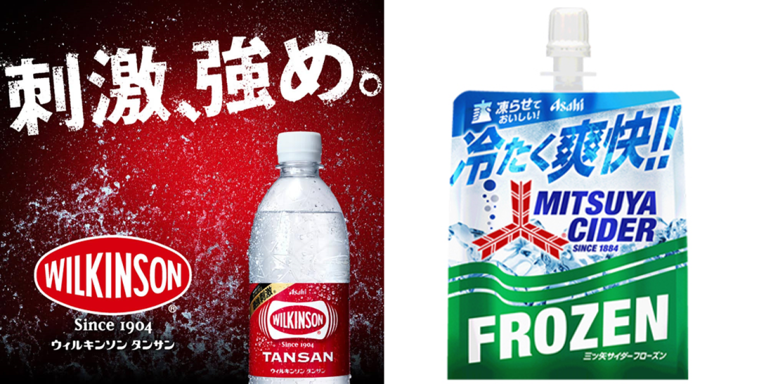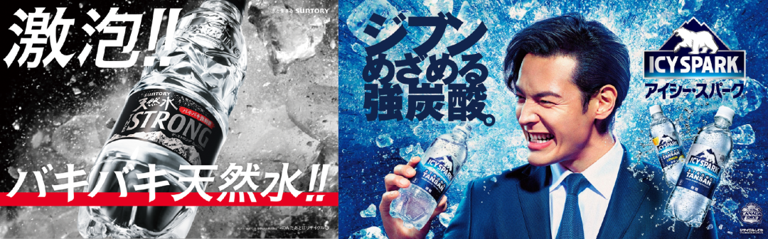 在日本有許多主打強(qiáng)碳酸的產(chǎn)品,如,朝日強(qiáng)碳酸氣泡水、朝日威爾金森系列、日本可口可樂推出的強(qiáng)碳酸感飲料ICY SPARK等。各個(gè)品牌也通過不同的技術(shù)增強(qiáng)自家氣泡水的碳酸感,這些產(chǎn)品也都主打由強(qiáng)碳酸帶來的清爽感和提神效果。這些產(chǎn)品在包裝和廣告營銷上都有醒目的“強(qiáng)碳酸”字眼,配色和宣傳都極具視覺沖擊力,讓人從視覺上就能感受產(chǎn)品帶來的清爽感。