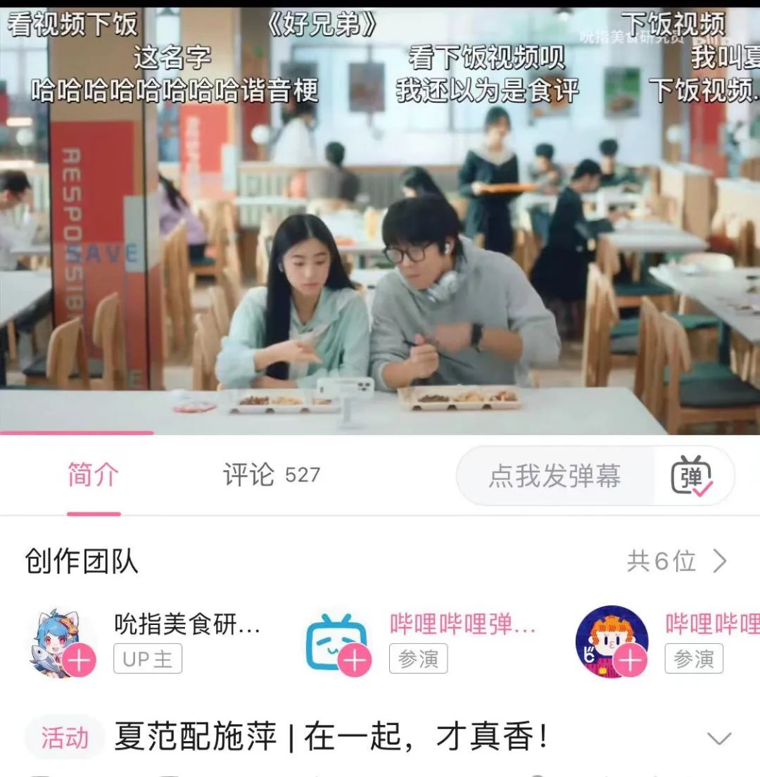 B站推出了創(chuàng)意短片《夏范配施萍 | 在一起,才真香!》,把下飯視頻擬人化,“夏范”、“施萍”化身為男女主人公演繹一段故事,意思是:代表下飯的烏江 x 代表視頻的B站,在一起才真香。