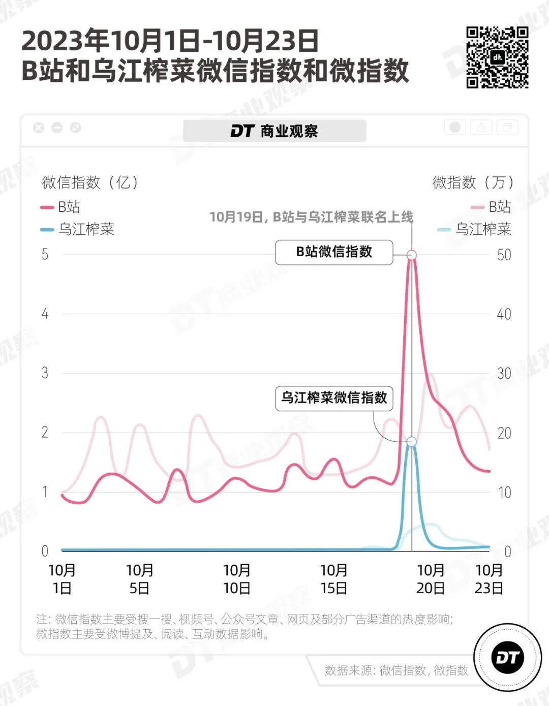從微信指數(shù)來看,10月19日之前,微信端B站和烏江榨菜的微信指數(shù)一直比較平穩(wěn)。