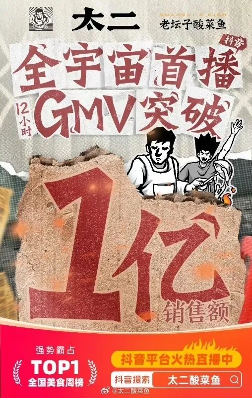 昨日,太二酸菜魚在抖音開啟首場直播,開播不到6小時銷售額便破億,賣出了近50萬張代金券、10萬份雙人餐等。