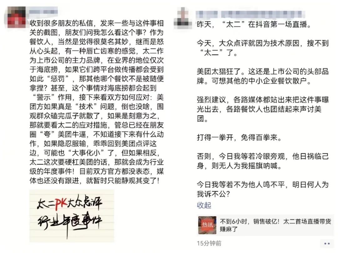 然而直播第二天,大眾點(diǎn)評上卻搜不到“太二”,堪稱戲劇性的一幕。這件事很快引發(fā)行業(yè)關(guān)注,不少餐飲人紛紛熱議:“美團(tuán)太猖狂了”“強(qiáng)烈建議聲討美團(tuán)”“若太二硬剛美團(tuán),會成為行業(yè)級的年度事件”……