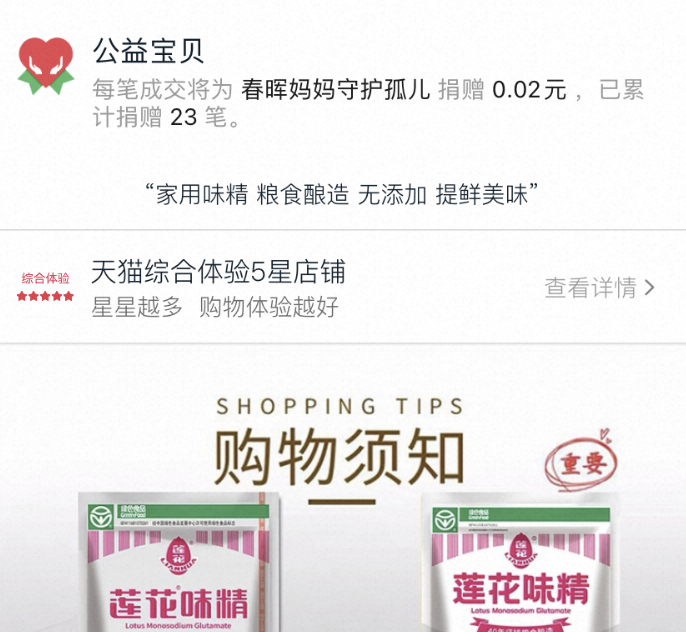(蓮花味精一包3.9元的味精也加入了公益寶貝。淘寶天貓商家可選擇任意商品加入公益寶貝,自主設(shè)置捐贈(zèng)金額、指定公益項(xiàng)目。)