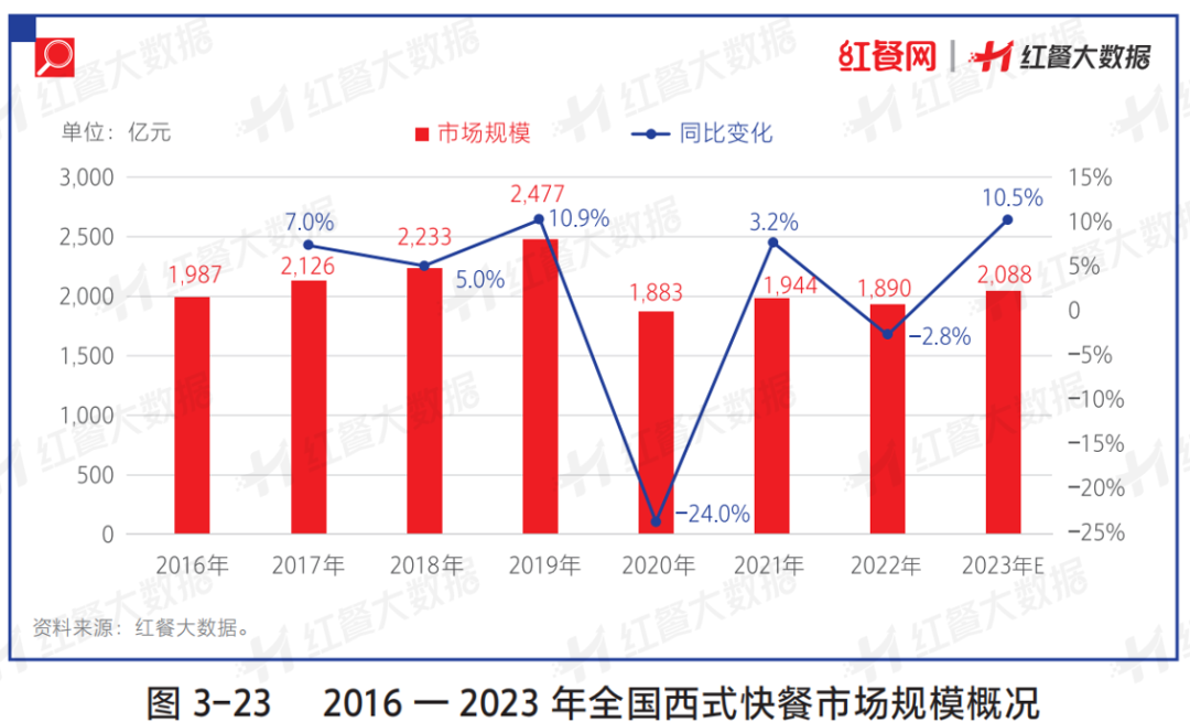 進(jìn)入2023年以來,西式快餐賽道迎來了快速發(fā)展期。紅餐大數(shù)據(jù)顯示,2023年我國(guó)西式快餐市場(chǎng)規(guī)模有望突破2,000億元。