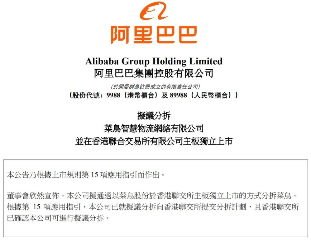 今年3月,阿里巴巴宣布進(jìn)行“1+6+N”組織變革,旗下具備條件的業(yè)務(wù)和公司都可以獨(dú)立融資和上市。半年后,阿里分拆上市第一股,花落菜鳥。近日,菜鳥智慧物流網(wǎng)絡(luò)有限公司向港交所主板發(fā)起沖擊,計(jì)劃募集至少10億美元。