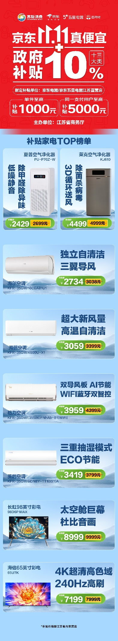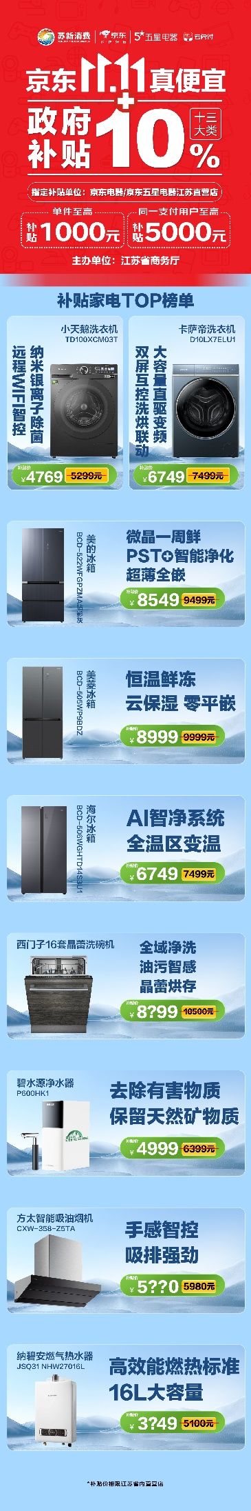 近期有家電購(gòu)買需求的消費(fèi)者可前往江蘇省內(nèi)京東電器城市旗艦店、京東五星電器各大直營(yíng)門店購(gòu)買綠色節(jié)能家電,享最高立減5000元的江蘇政府補(bǔ)貼,同時(shí),還能參與京東五星電器11.11大促活動(dòng),雙重補(bǔ)貼疊加,最高可享補(bǔ)貼35%,還有像100升冷柜低至499元,一級(jí)能效變頻空調(diào)低至1899元,75英寸大屏彩電低至2879元,530升對(duì)開門風(fēng)冷冰箱低至2299元,等等爆款5折起,為消費(fèi)者打造家電“最佳入手期”。