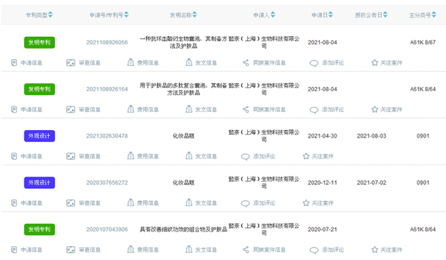 在專利研發(fā)上,優(yōu)時顏做了一定的努力,也是優(yōu)時顏長期進行品牌營銷的一大方向。據(jù)公開信息顯示,優(yōu)時顏品牌所屬的“懿奈(上海)生物科技有限公司”旗下共有18項專利,與營銷描述相符。但質(zhì)疑也如影隨形——優(yōu)時顏在2017年申請的第一個發(fā)明專利“一種具有控油功效的組合物及其應(yīng)用”,目前處于等待合議組成立狀態(tài)。另據(jù)通知書發(fā)文信息顯示,其于2018年進入實質(zhì)審查階段,但在2021年3月被發(fā)駁回決定。