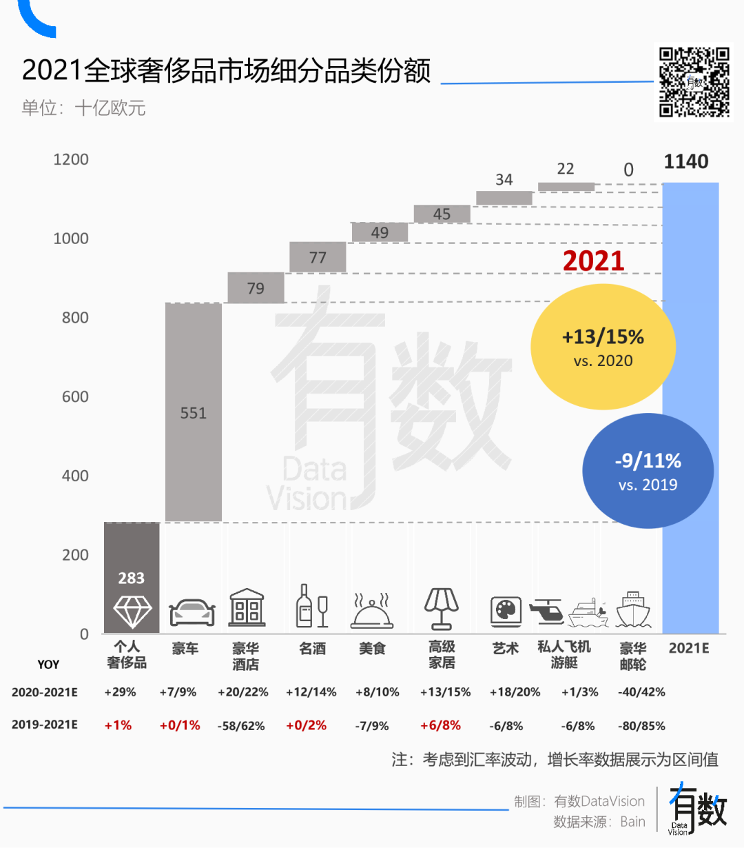 通常來說,奢侈品市場包括個人奢侈品、豪車、豪華酒店、豪華游輪、高檔家具、美食、酒、私人飛機(jī)/游艇及藝術(shù)在內(nèi)的九大細(xì)分市場。