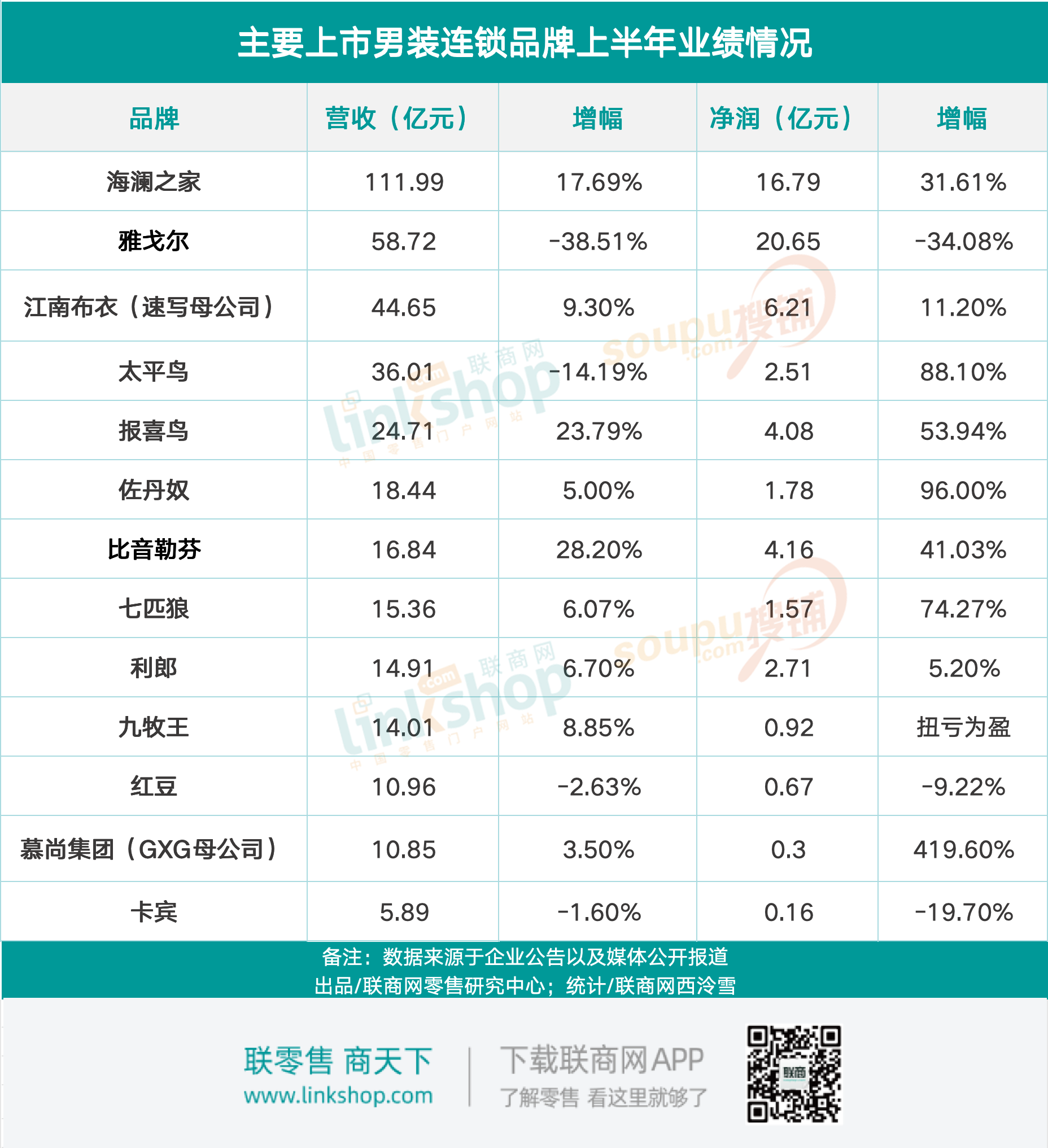 《聯(lián)商網(wǎng)》統(tǒng)計(jì)發(fā)現(xiàn),2023年上半年,13家男裝連鎖品牌上市企業(yè)實(shí)現(xiàn)營(yíng)業(yè)收入超383億元,凈利潤(rùn)超62億元。