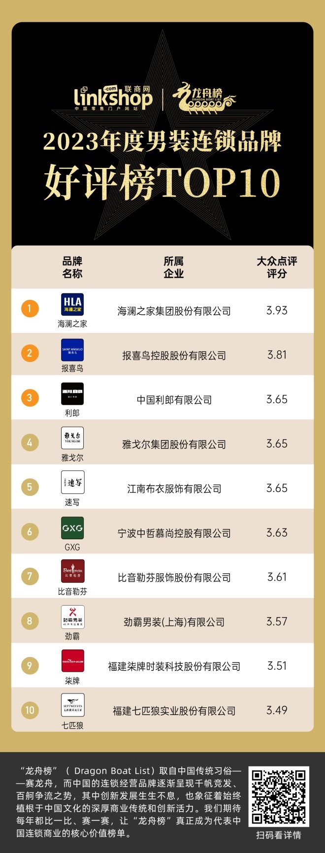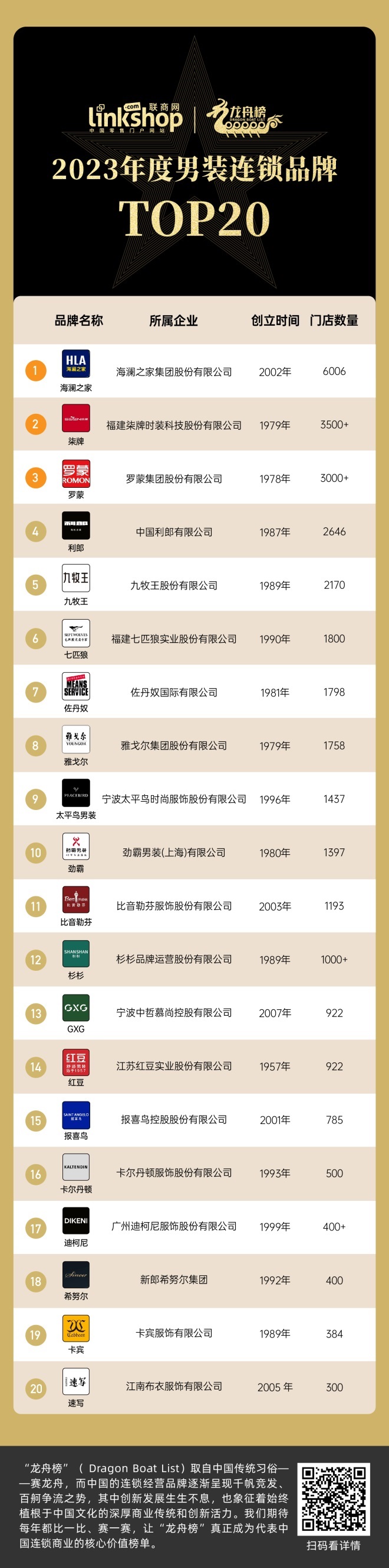 本期,《聯(lián)商網(wǎng)》聚焦男裝連鎖品牌,特別推出龍舟榜之“2023年度男裝連鎖品牌TOP20”,從門店數(shù)量、消費(fèi)者滿意度等維度一窺各大品牌的經(jīng)營(yíng)和發(fā)展情況,以及男裝連鎖品牌呈現(xiàn)的發(fā)展特征及未來空間。
