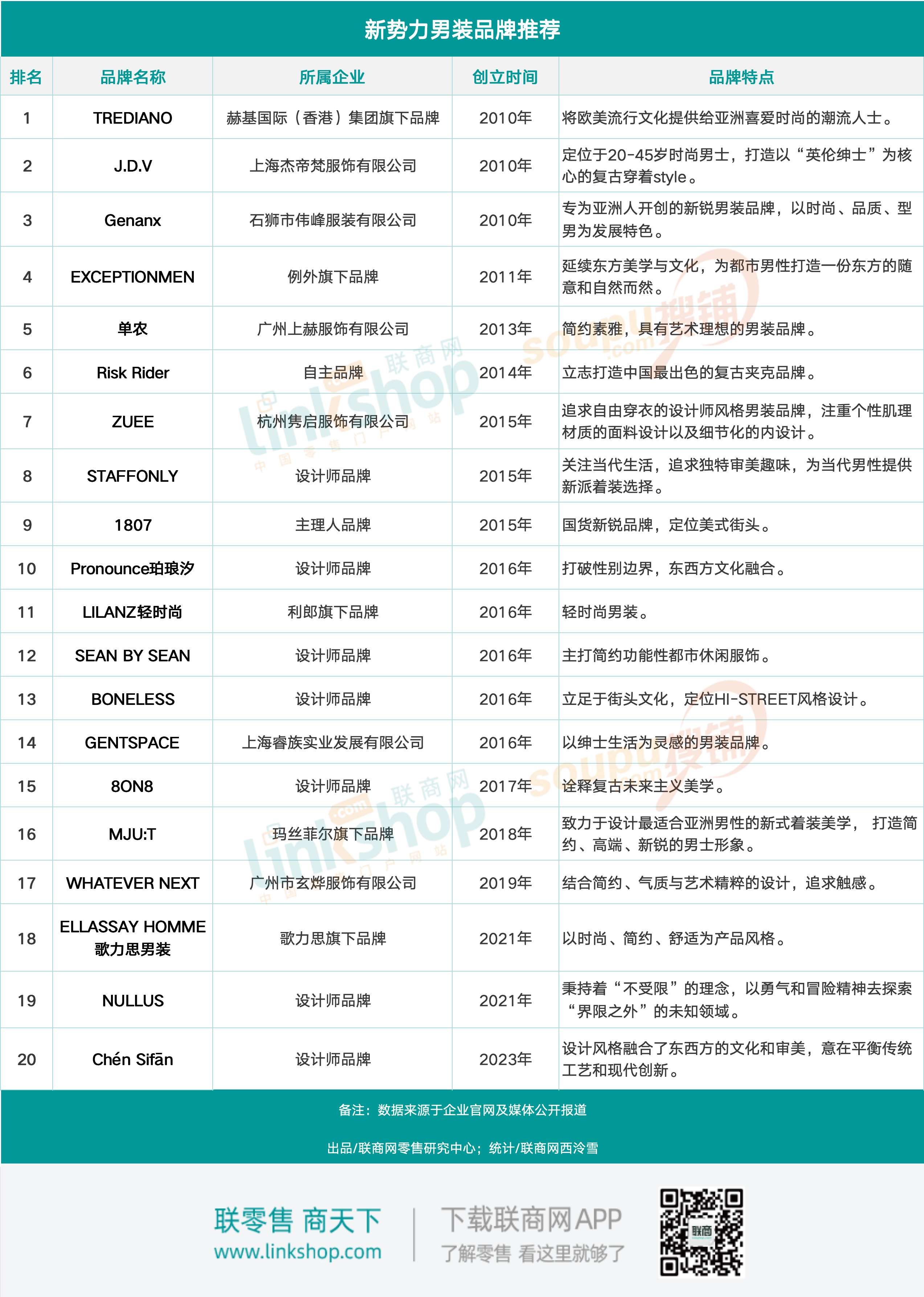 這些品牌大多創(chuàng)立于2010年以后,一部分由成熟品牌孵化而來,如EXCEPTIONMEN為例外旗下品牌、LILANZ輕時(shí)尚為利郎旗下品牌、MJU:T為瑪絲菲爾旗下品牌;一部分為設(shè)計(jì)師品牌,如STAFFONLY、Pronounce珀瑯汐、8ON8、NULLUS等;另外,還有部分品牌是在線上起步,擁有一定知名度后開始走向線下,開設(shè)實(shí)體門店,如BONELESS等。