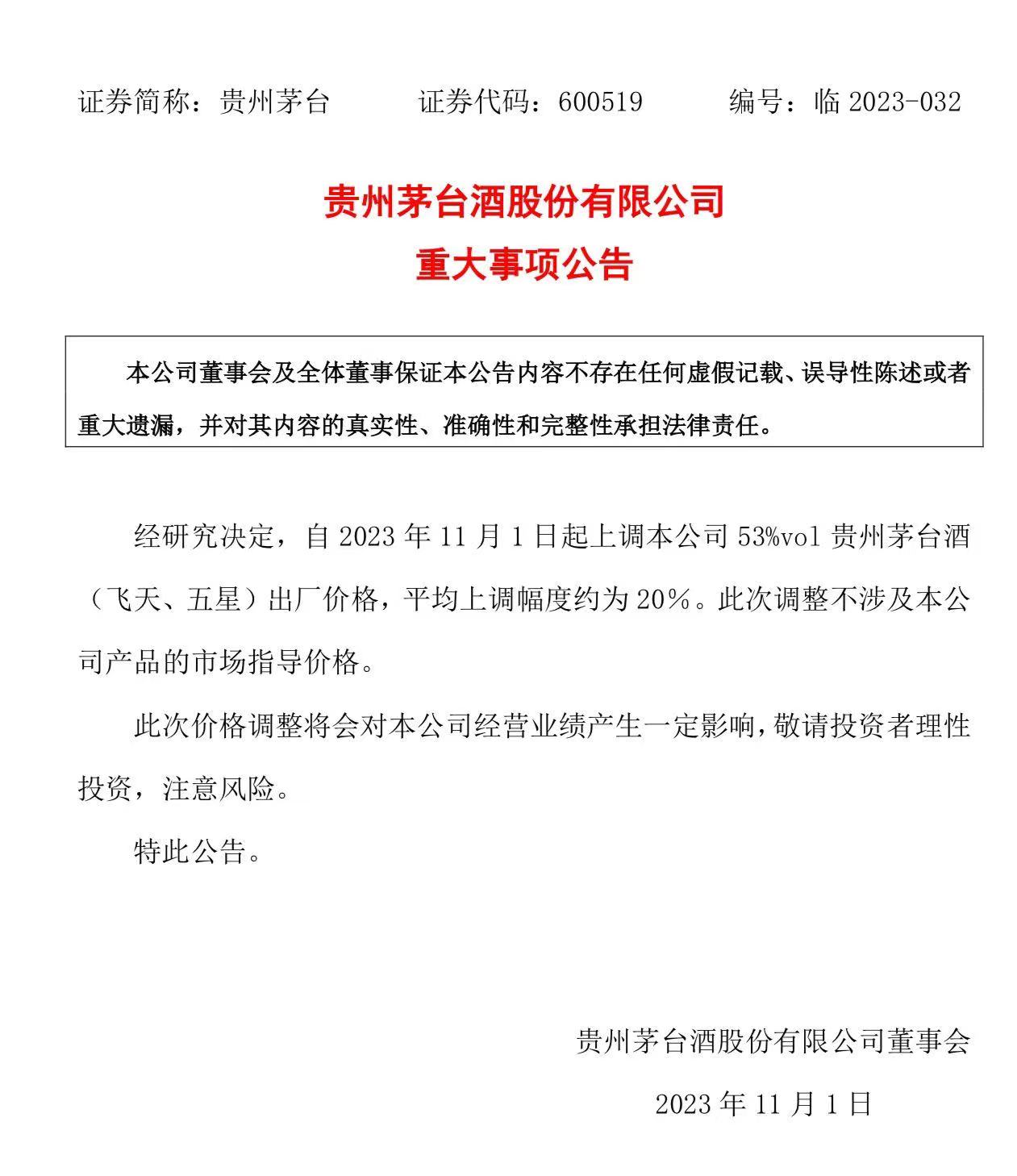 公告顯示,經(jīng)研究決定,自2023年11月1日起上調(diào)本公司53%vol貴州茅臺酒(飛天、五星)出廠價格,平均上調(diào)幅度約為20%。此次調(diào)整不涉及本公司產(chǎn)品的市場指導(dǎo)價格。