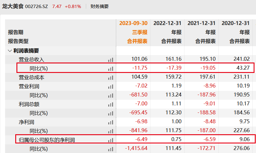 在10月20日發(fā)布的2023年三季報中,龍大美食今年前三季度實現(xiàn)營業(yè)收入101.06億元,同比下滑11.75%;歸母凈利潤虧損6.49億元,同比下跌1415.64%。