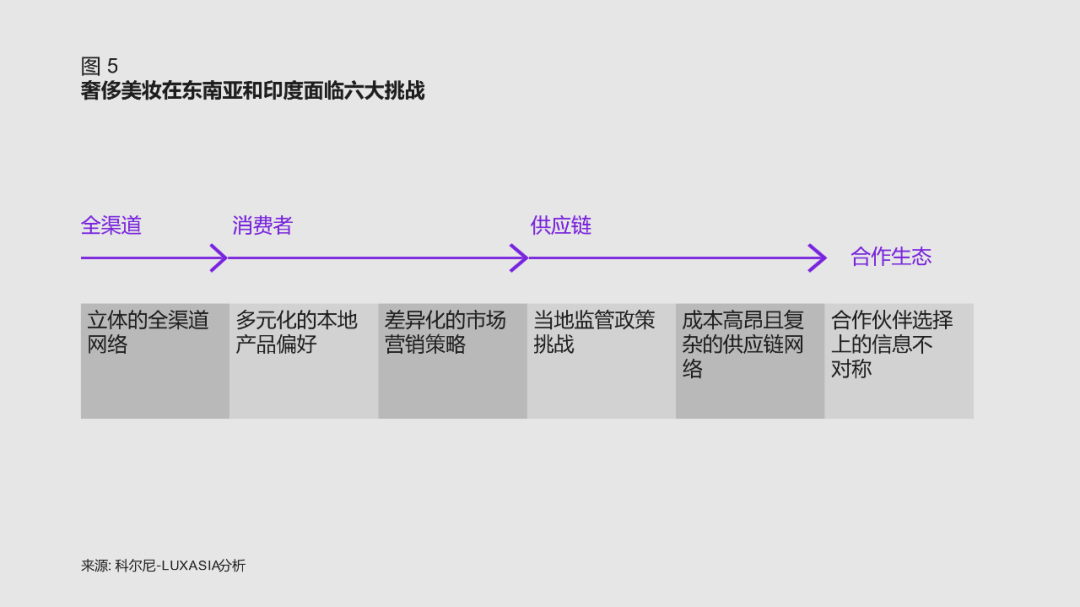 由于市場環(huán)境的多樣性,在東南亞和印度實現(xiàn)增長仍然是一項棘手的任務(wù)。品牌在這個多元化及碎片化的地區(qū)將面臨六大挑戰(zhàn)(參見圖5),這意味著,增長戰(zhàn)略不能一刀切。