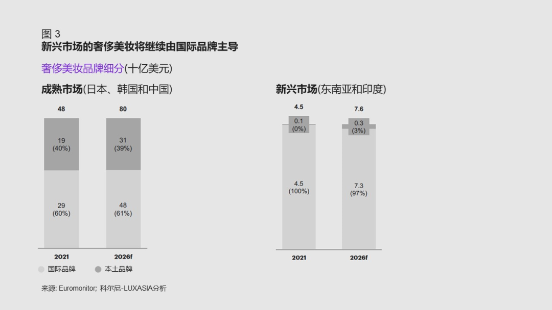 我們相信,這些快速增長的東南亞和印度奢侈美妝市場將繼續(xù)由國際品牌主導(dǎo)。在成熟市場,本土品牌的市占率高達(dá)40%(參見圖3)。相比之下,新興市場上本土奢侈品牌的市占率要低得多。