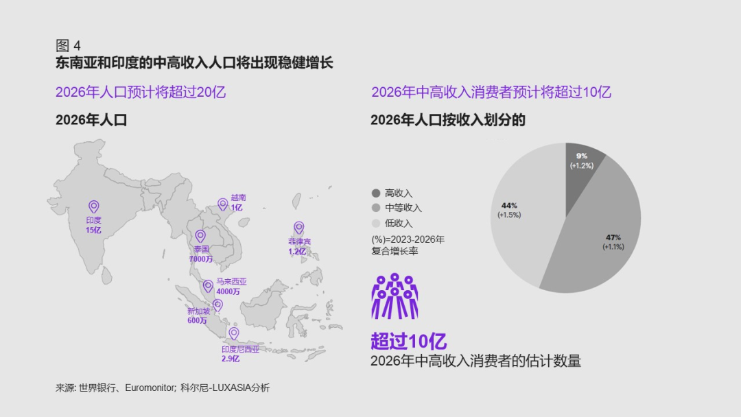 處于這一發(fā)展階段的國家通常擁有規(guī)模可觀且仍在迅速增長的中產(chǎn)階級群體。隨著東南亞和印度經(jīng)濟(jì)的成熟,更多消費者的經(jīng)濟(jì)階層會上升,從大眾消費邁向奢侈消費。預(yù)計到2026年,該地區(qū)中產(chǎn)階級及高收入階層的總消費者規(guī)模將超過10億(參見圖4)。