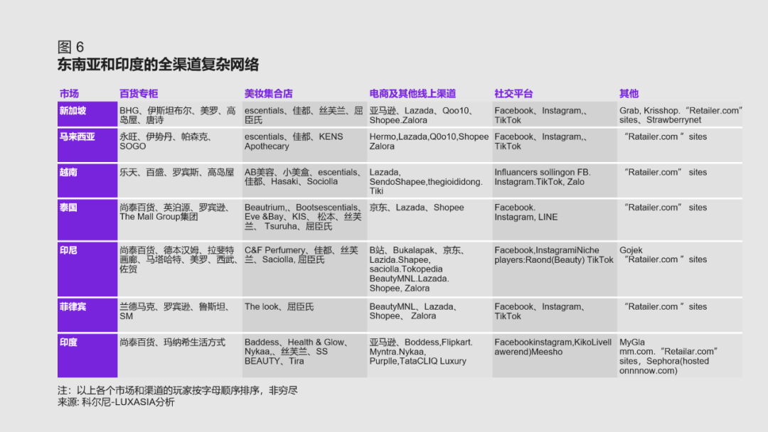 現(xiàn)今,奢侈購物的需求已經(jīng)演變?yōu)榘下零售、線上電商和社交平臺等業(yè)態(tài)的綜合需求。由于各個市場的平臺與渠道各有不同,使得這一在線消費生態(tài)系統(tǒng)更加錯綜復(fù)雜。圖6詳盡地展現(xiàn)了東南亞和印度的全渠道網(wǎng)絡(luò)復(fù)雜性。