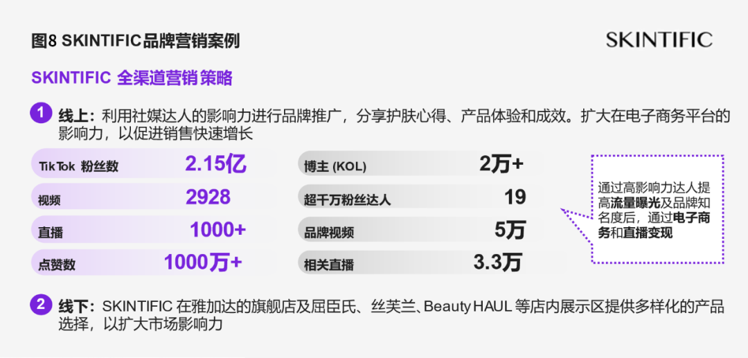 SKINTIFIC通過雙管齊下的線上線下品牌營銷打法,迅速在東南亞消費者心目中占領(lǐng)了“健康護(hù)膚”的品牌心智(參見圖8)。同時,SKINTIFIC采取KOL營銷打法,與10萬~1000萬粉絲的博主廣泛合作,從而成功吸引和觸及各類型消費者,高效宣傳其高性價比產(chǎn)品。
