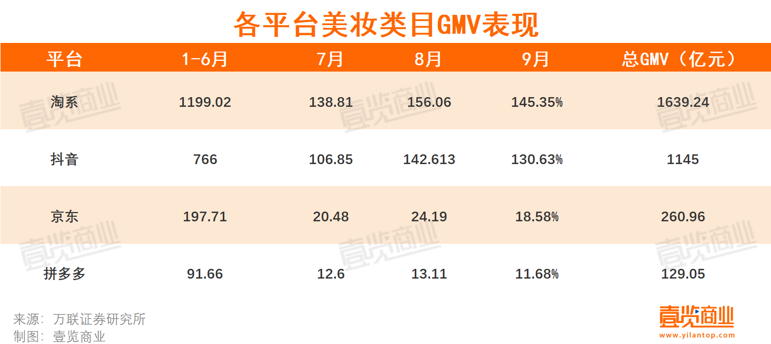 據(jù)品觀統(tǒng)計(jì),今年前三季度,抖音美妝GMV整體超1130億元。萬(wàn)聯(lián)證券研究所數(shù)據(jù)顯示,前三季度淘系、京東、拼多多三大渠道美妝類目GMV分別為1639.24億元、260.96億元、129.05億元。