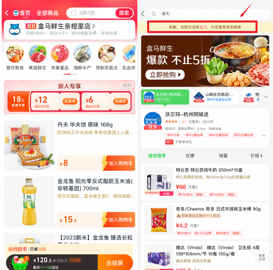 左:京東的盒馬官方旗艦店 右:內(nèi)置“京東到家”的大潤發(fā)