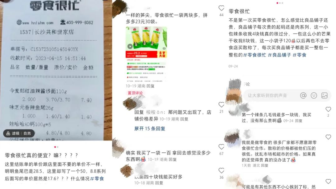 同時,雖然零食折扣店的部分單品采取散稱計價,讓消費者感覺便宜,但在第三方社交平臺上,不少消費者表示如果將零食很忙的產(chǎn)品稱重價換算為件單價,和電商平臺相比并不便宜,性價比一般。