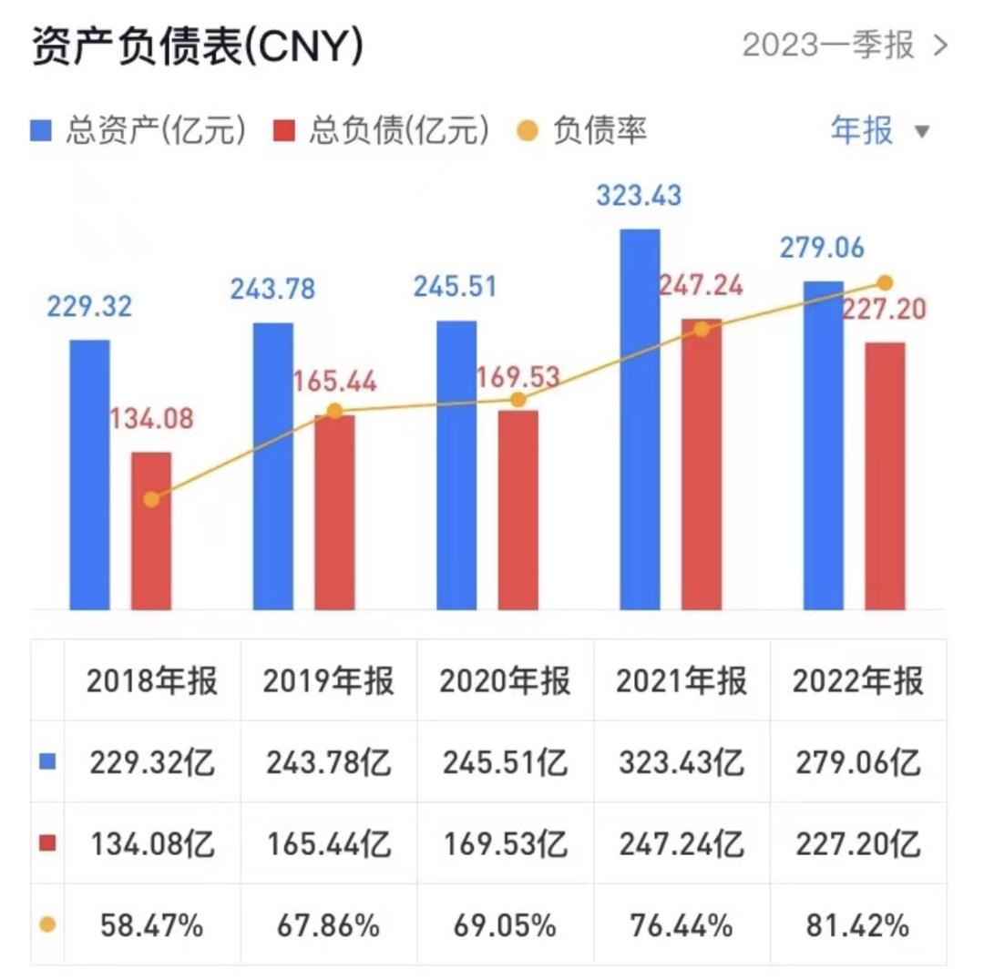 粗略統(tǒng)計(jì)顯示,2018年-2022年上半年,步步高累計(jì)投資近68億元用于自建房地產(chǎn)。但其資產(chǎn)增速趕不上負(fù)債的攀升速度,負(fù)債率從2018年的58%增高到2022年的81%。2022年末,步步高總資產(chǎn)為279.06億元,其中約150億元為投資性房地產(chǎn),而這些資產(chǎn)已基本用于銀行借款抵押。