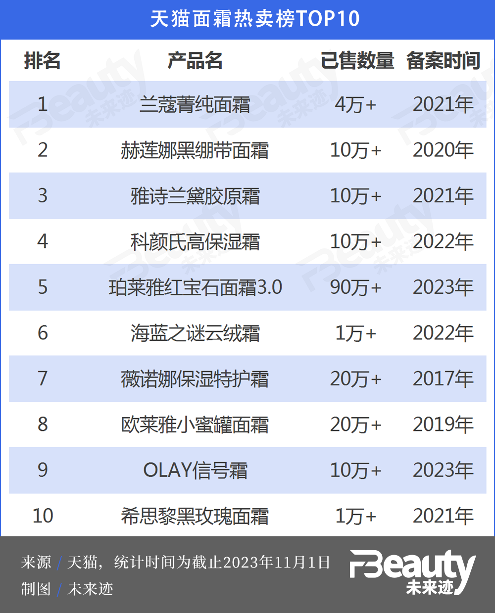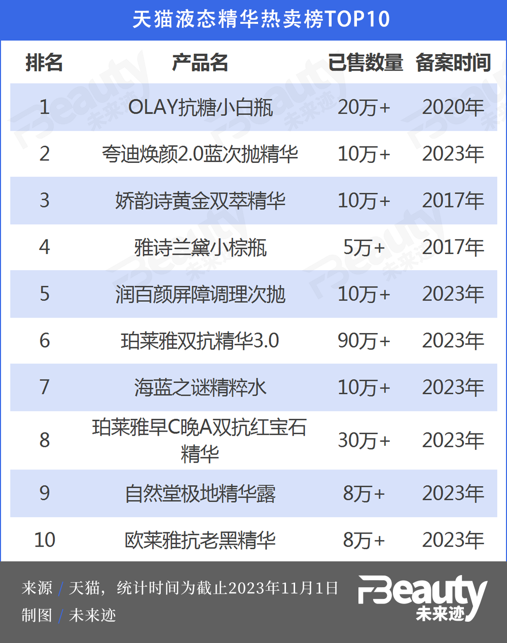 從天貓面霜和精華熱賣(mài)榜不難看出,除了少數(shù)經(jīng)典產(chǎn)品,絕大多數(shù)暢銷(xiāo)單品都是最近2年進(jìn)行過(guò)重要升級(jí)的新品。尤其是精華類(lèi)產(chǎn)品,主要暢銷(xiāo)單品的最新備案時(shí)間基本集中在2023年。