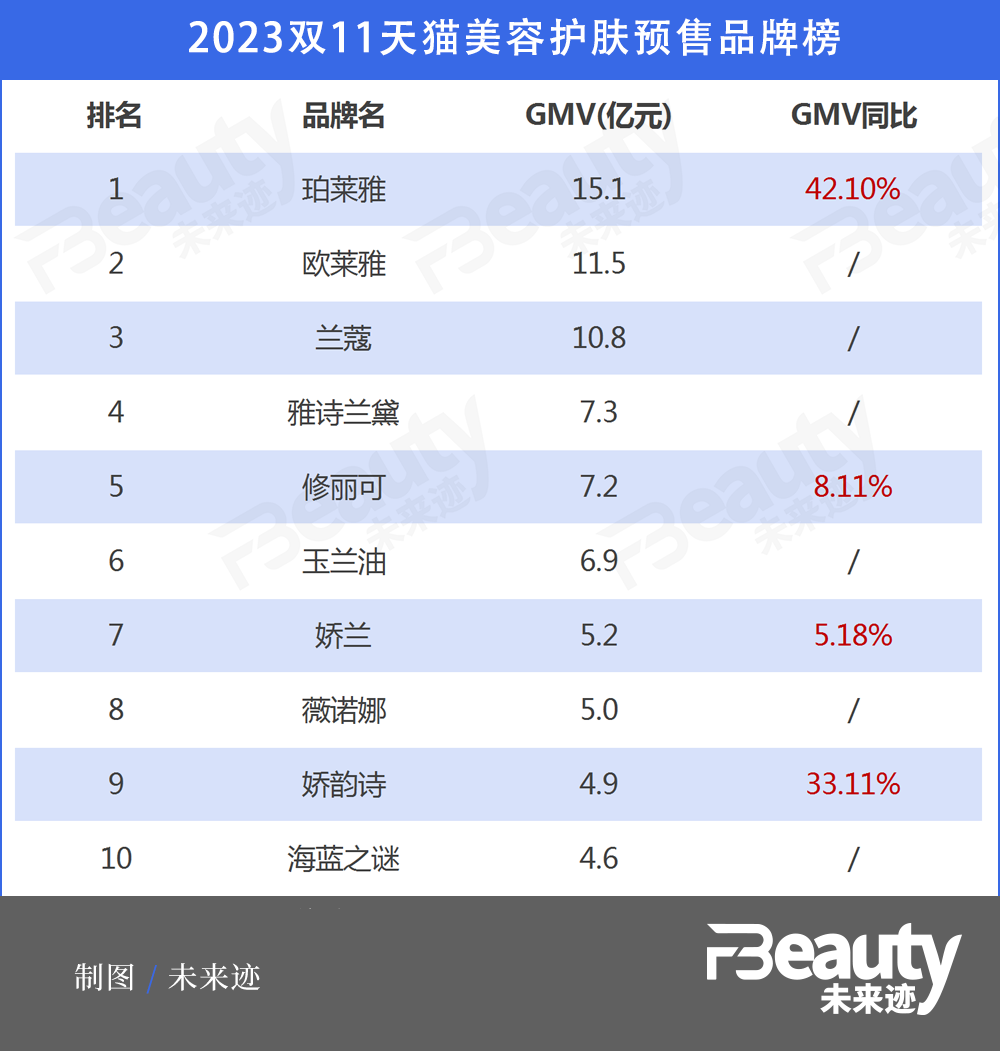 統(tǒng)計(jì)數(shù)據(jù)顯示,10月24日至10月31日,天貓美容護(hù)膚品預(yù)售前十的品牌中,除珀萊雅、修麗可、嬌蘭、嬌韻詩(shī)4個(gè)品牌GMV同比有上漲之外,其它品牌均處于下滑狀態(tài),并且同比下滑平均超過(guò)20%。