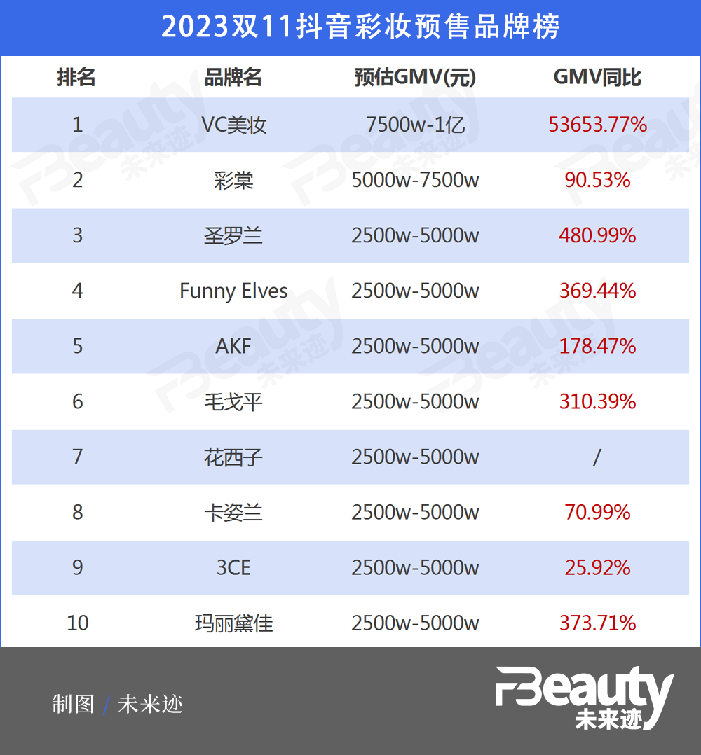 抖音則整體處于上升狀態(tài),飛瓜數(shù)據(jù)顯示:預(yù)售期間抖音美妝的整體GMV同比增長(zhǎng)68.79%。彩妝和護(hù)膚TOP10品牌幾乎全部處于增長(zhǎng)狀態(tài),且大多數(shù)品牌的同比增長(zhǎng)率在100%以上。