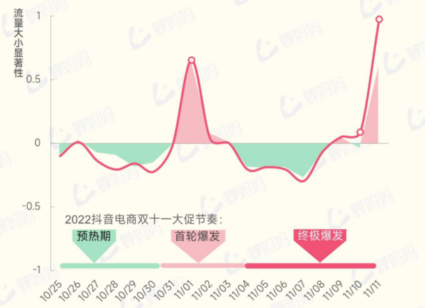 根據(jù)蟬媽媽對(duì)歷年雙11流量的監(jiān)測(cè),整個(gè)促銷(xiāo)周期在10月31日左右會(huì)迎來(lái)首輪爆發(fā),隨后進(jìn)入平銷(xiāo)售階段,并最終在雙11當(dāng)天迎來(lái)最后一輪爆發(fā)。