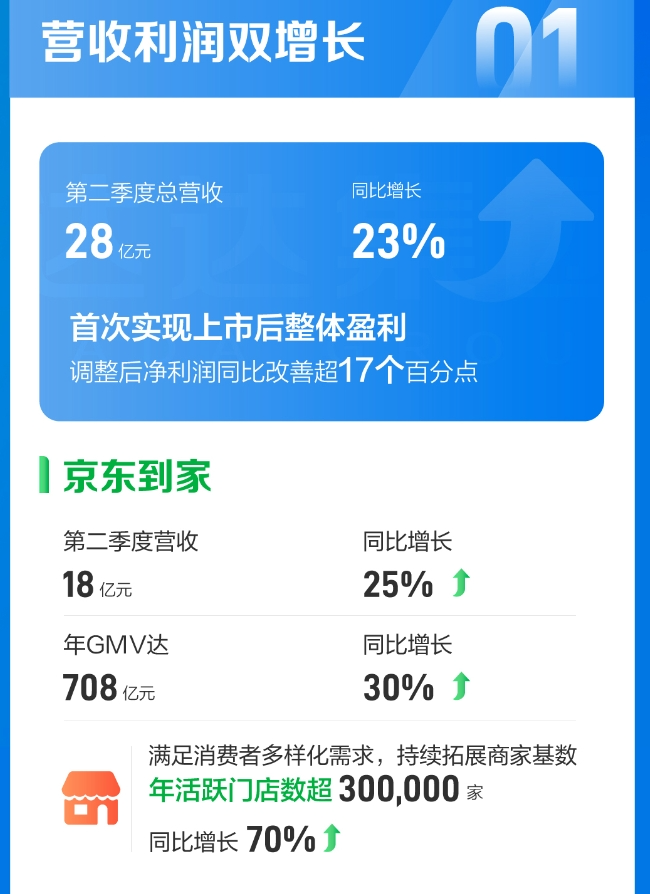 而京東到家平臺(tái)二季度營(yíng)收18億元,同比增長(zhǎng)25%。即時(shí)零售收入增長(zhǎng),主要得益于達(dá)達(dá)集團(tuán)商家基數(shù)的擴(kuò)大,與商家供給的豐富。