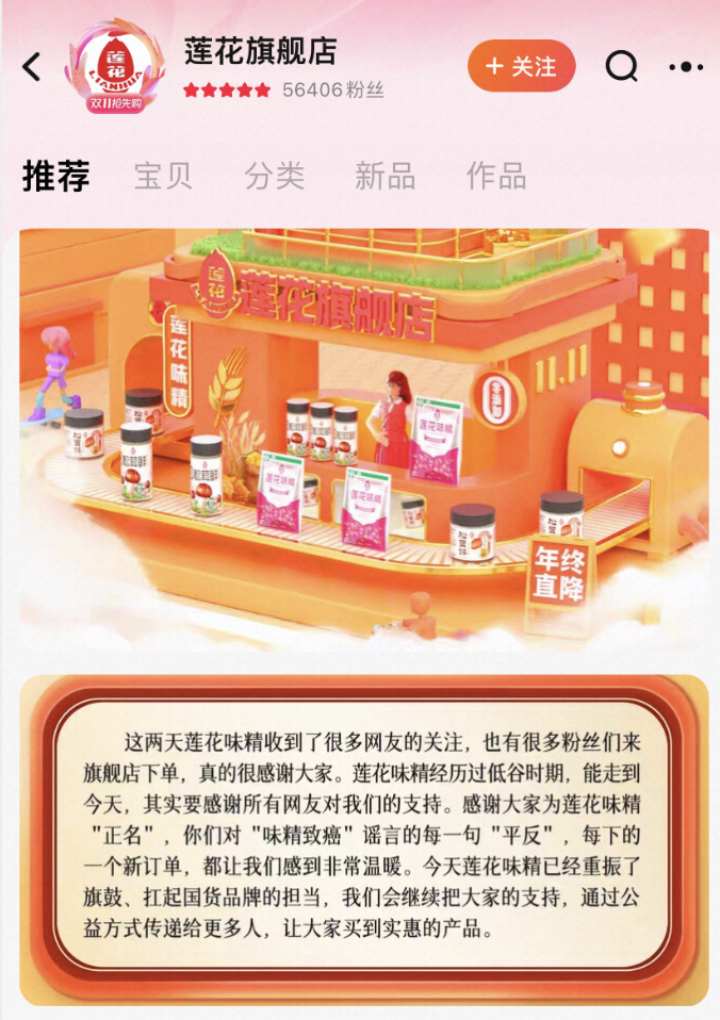 記者注意到,蓮花味精還把回應(yīng)搬上了店鋪公告。公告稱,感謝大家為蓮花味精“正名”,網(wǎng)友對(duì)“味精致癌”謠言的每一句澄清,每下的一個(gè)新訂單,都讓我們感到非常溫暖。今天蓮花味精已經(jīng)重振了旗鼓、扛起國貨品牌的擔(dān)當(dāng),我們會(huì)繼續(xù)把大家的支持,通過公益方式傳遞給更多人,讓大家買到實(shí)惠的產(chǎn)品。