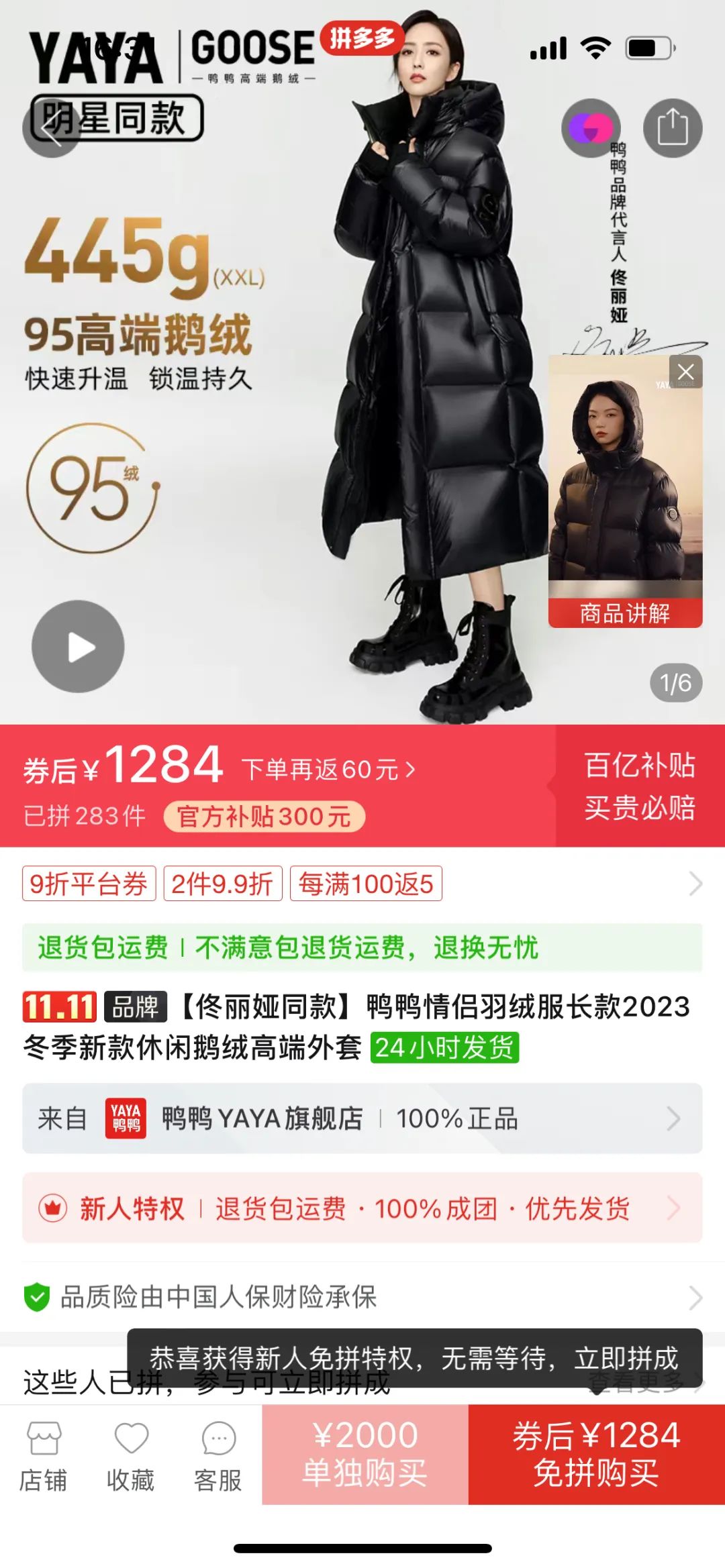 《聯(lián)商網(wǎng)》在拼多多百億補(bǔ)貼頻道發(fā)現(xiàn),鴨鴨一款含白鴨絨量90%,售價(jià)109元的輕薄款羽絨服,已經(jīng)拼出8.7萬(wàn)件。