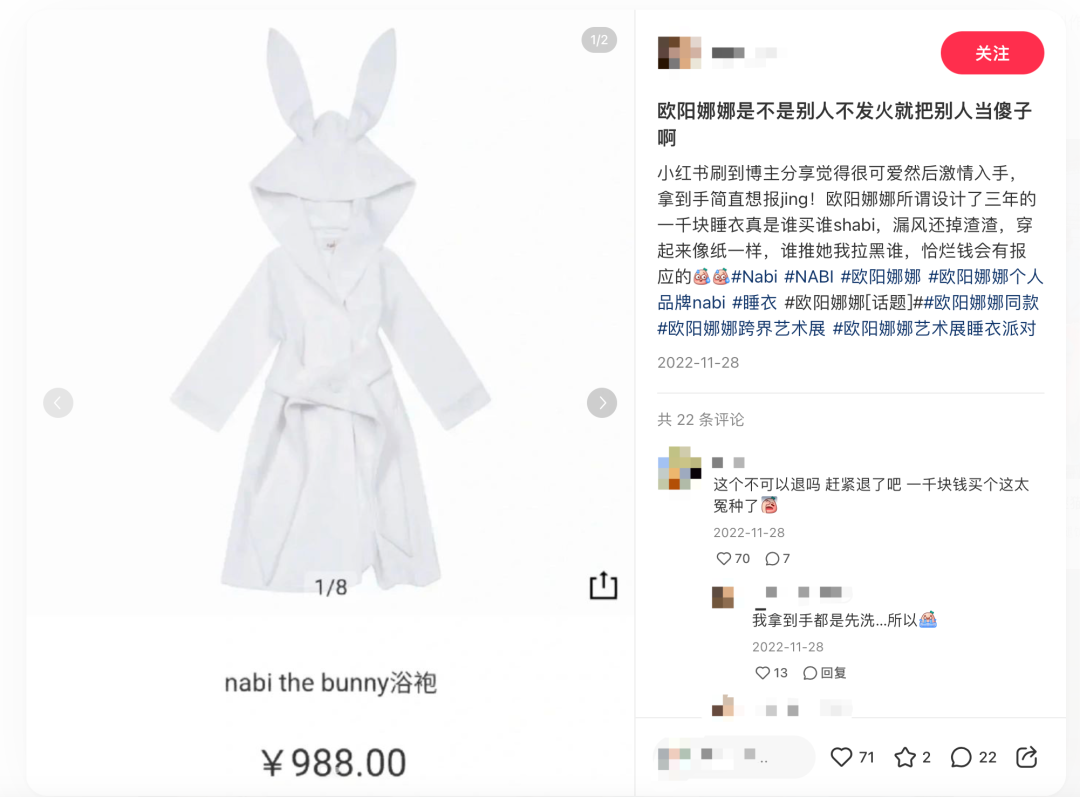 但優(yōu)勢的反面也意味著更大的爭議,不少明星的潮牌都因為價格、質量、售后服務等問題被認為是割韭菜,甚至還會反噬藝人本身的口碑。之前歐陽娜娜推出的個人品牌nabi,就被質疑價格太高、與質量不符合。但即便沒有高溢價,很多明星的個人品牌在推出之即也會被貼上了“割韭菜”、“質量堪憂”等標簽。
