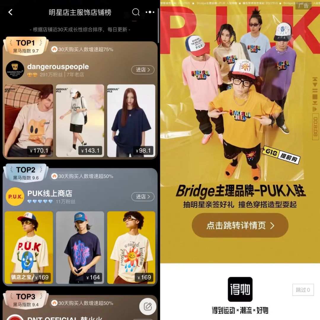令人意外的是,成立一年半以來,PUK已經(jīng)跑到了眾多同類型品牌的前列——淘寶官方旗艦店多次進入“明星店主服飾店鋪榜”的TOP10;第一年入駐得物就成了得物的重要戰(zhàn)略合作伙伴。
