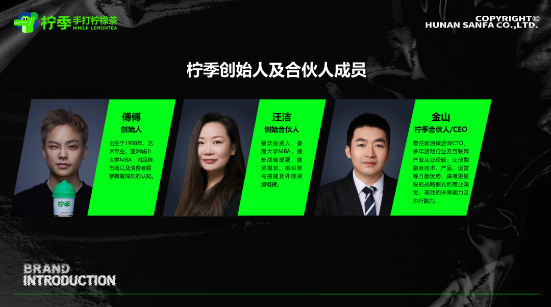 “我一直都說,檸季不是一個(gè)茶飲公司,而是一個(gè)互聯(lián)網(wǎng)公司!痹跈幖镜娜瞬懦刂,有來自游戲、互聯(lián)網(wǎng)、營(yíng)銷等各行各業(yè)的人才,他們年齡差、背景差、學(xué)歷差巨大。其中,創(chuàng)始人傅傅,98年的年輕人,學(xué)藝術(shù)專業(yè),亞洲城市大學(xué)MBA,對(duì)品牌、市場(chǎng)以及消費(fèi)者洞察有著深刻的認(rèn)知 ;CEO金山,曾是新浪微游戲CTO……