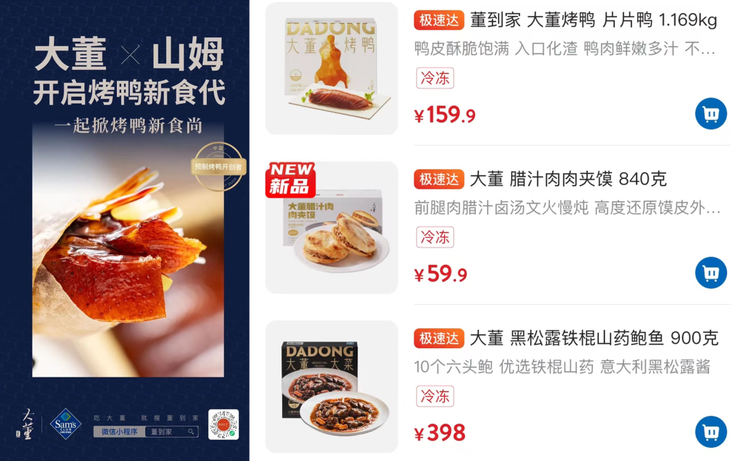 在山姆中的餐飲品牌只有大董,有烤鴨、肉夾饃還有一款售價398元的黑松露鐵棍山藥鮑魚的“大董大菜”。