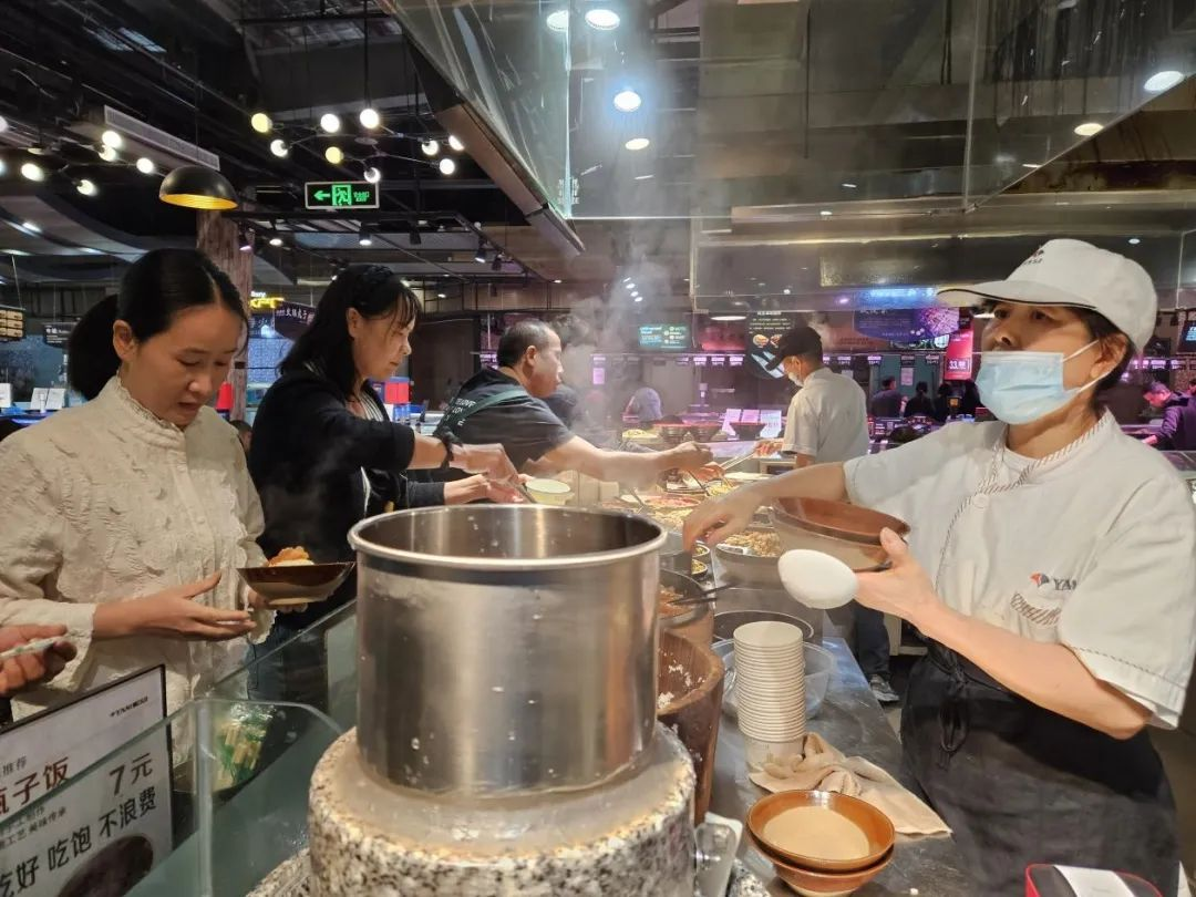 幾十個開放式、透明的現(xiàn)制餐飲檔口,超過八十種琳瑯滿目的菜品,其中最受歡迎的,是西南特色苞谷飯的檔口,配以18種地道的土家族風(fēng)味菜,僅需7元便可盡享“吃到飽”。