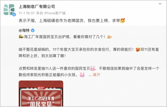 據(jù)說(shuō),有些網(wǎng)友已經(jīng)趁著雙11鉅惠在線助力那些國(guó)貨老牌了,包括因?yàn)椤袄夏曛鞑F(tuán)“火起來(lái)的活力28,網(wǎng)友在為這些寶貝助力”100W+“的同時(shí),也在強(qiáng)烈呼吁淘工廠將年度寶貝的榜單擴(kuò)充下去。