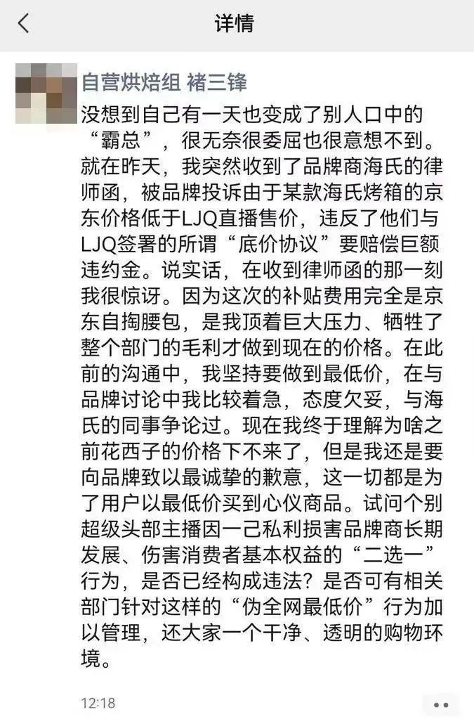 10月24日,一名負(fù)責(zé)海氏烤箱的京東采銷在朋友圈直接開炮,原因是,他收到海氏公司的律師函,因一款烤箱的京東售價低于李佳琦直播售價,違反了海氏與李佳琦簽署的「底價協(xié)議」,要求賠償違約金。當(dāng)天下午,「京東采銷喊話李佳琦」登上微博熱搜。