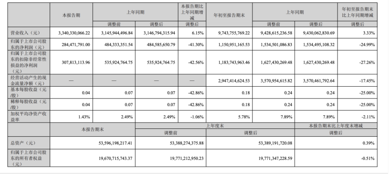 但在歸母凈利潤上,第三季度內(nèi),7.11億元的虧損,直接讓這個數(shù)據(jù)比去年同期減少了342.85%。而其第一季度1.46億元和第二季度481.94萬元的利潤雖然同比去年下滑明顯,但至少保持在正值。