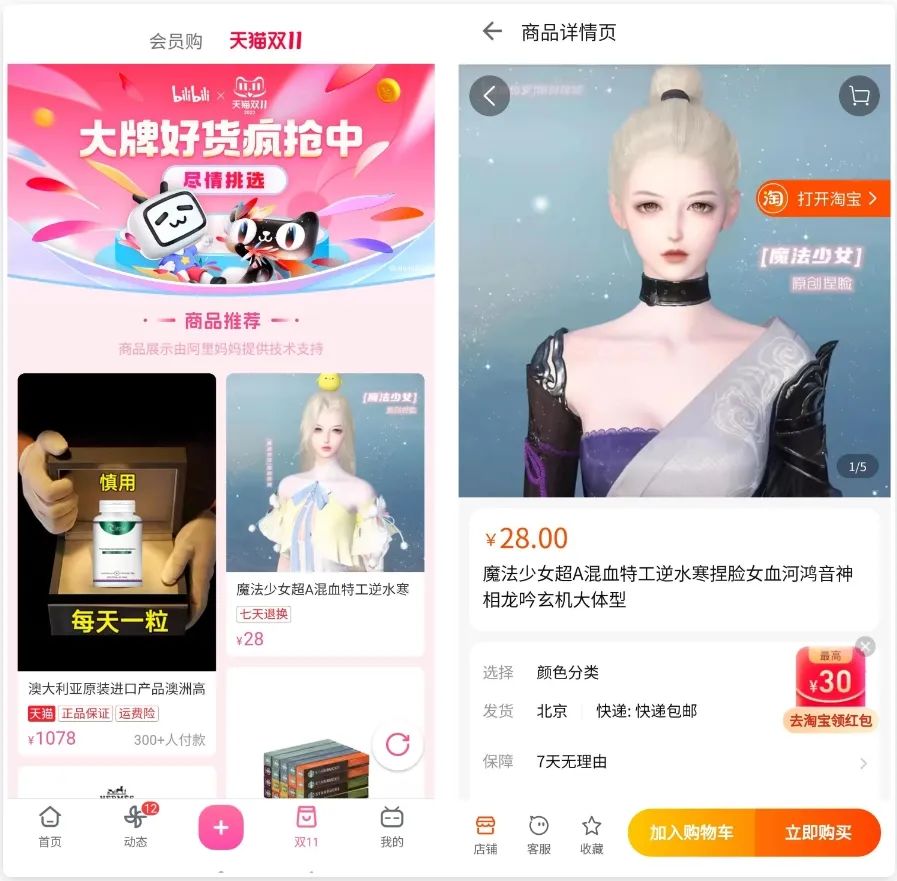 最明顯的不是“天貓”或“京東”輪替上場的開屏廣告,而是B站App端的暫時(shí)改版,原先底部的“會(huì)員購”入口最近已經(jīng)更名為“雙11”;打開頁面后,在原先的會(huì)員購之外還新增了“天貓雙11”板塊,直接展示商品并支持跳轉(zhuǎn)天貓頁面購買。