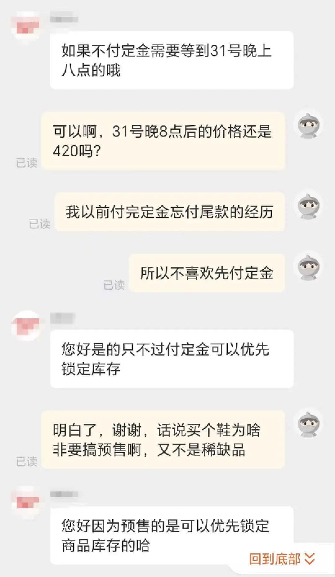 “我先是問(wèn)客服能不能再開通下尾款支付,因?yàn)槲移鋵?shí)還是蠻想要這雙鞋的,被拒絕后我又跟對(duì)方協(xié)商退定金,但對(duì)方把預(yù)售規(guī)則發(fā)給我看,說(shuō)退不了。這不是搶錢嗎?”自此,喬安對(duì)預(yù)售的印象就好不起來(lái),也開始抵觸任何形式的提前付定金。