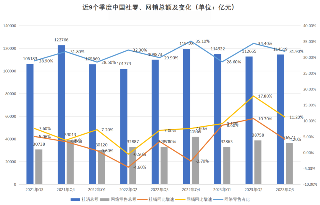 國家統(tǒng)計局數(shù)據(jù)顯示,2023年1~9月,全國網(wǎng)上零售額10.8萬億元,增長11.6%,高于社會消費品零售總額增速4.8個百分點,實物網(wǎng)零對社零增長貢獻率達33.9%。