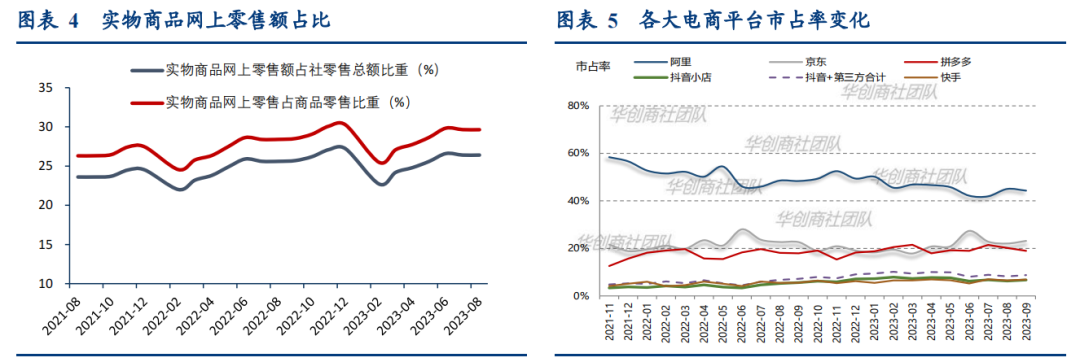 根據(jù)華創(chuàng)證券統(tǒng)計,線上滲透率穩(wěn)定提升至33%,增速平穩(wěn)仍高于線下。23年1-3Q五大電商平臺匯總GMV,同比增速為11%,根據(jù)統(tǒng)計局與郵政局數(shù)據(jù)計算,1~8月實物網(wǎng)上零售額79821億元,同比增長9.5%,1-8月累計全網(wǎng)包裹件單價98元/件,延續(xù)線上消費降級趨勢。