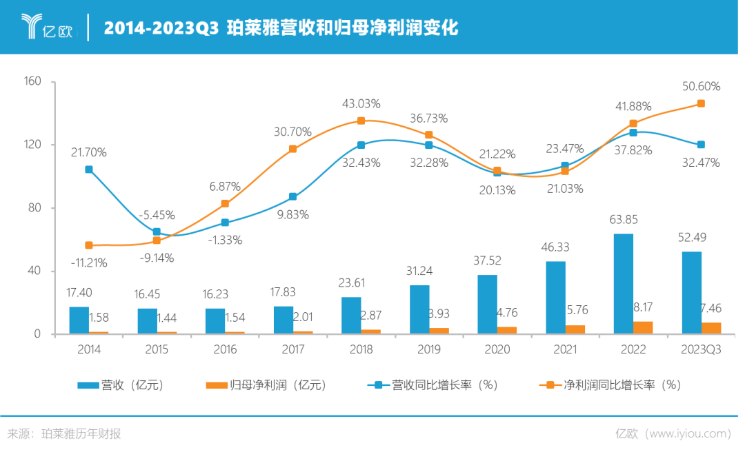 財(cái)報(bào)數(shù)據(jù)顯示,2020-2022年,珀萊雅的營收分別為37.52億元、46.33億元、63.85億元,歸母凈利潤分別為4.76億元、5.76億元、8.17億元;2023年剛過三個(gè)季度,珀萊雅的營收已達(dá)到52.49億元,并首次登頂A股國貨美妝公司營收TOP1。