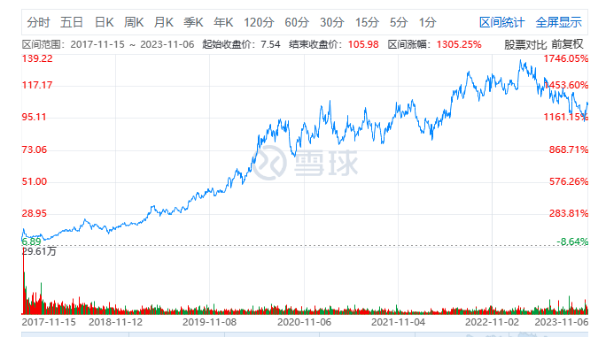 經(jīng)過幾個(gè)時(shí)期的不斷努力,珀萊雅的規(guī)模逐漸做大。2017年11月,珀萊雅以15.34元/股發(fā)行價(jià)登陸上交所,成為“國產(chǎn)美妝第一股”;上市后其股價(jià)一路攀升,于2022年5月突破百元大關(guān);截至2023年11月6日收盤,珀萊雅股價(jià)106.02元/股,總市值超400億元。