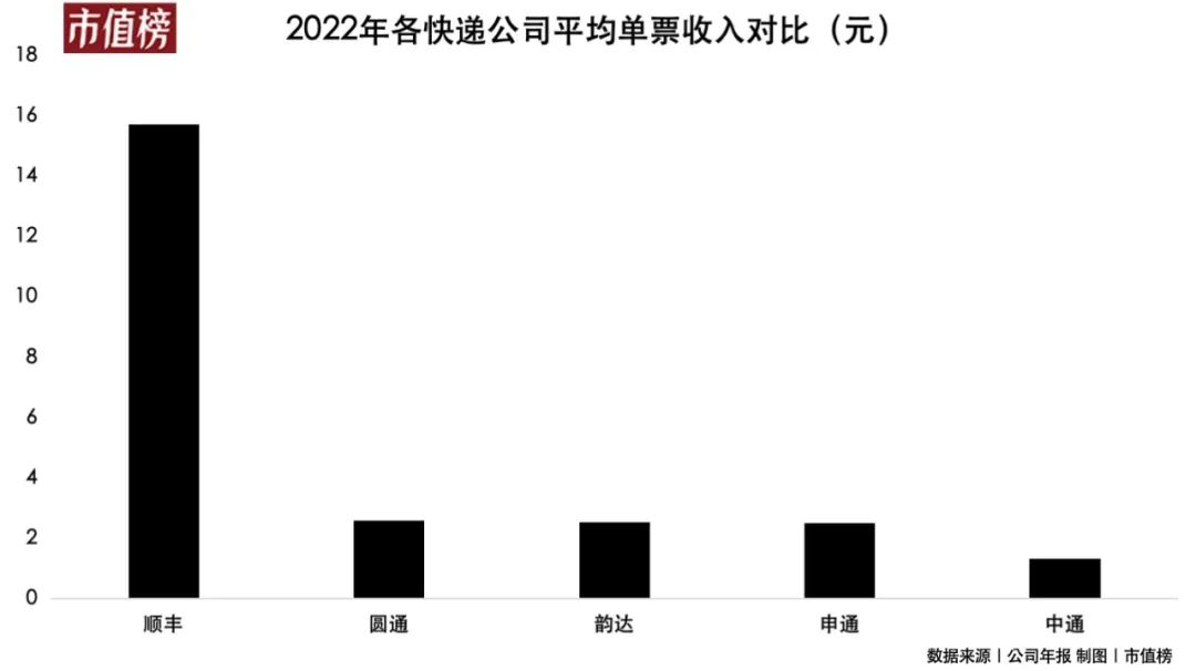 電商件的單票收入遠(yuǎn)低于商務(wù)件的單票收入,比如2022年,順豐的平均單票收入為15.73元,而圓通、韻達(dá)、申通、中通的單票收入分別只有2.59元、2.55元2.52元、1.34元。